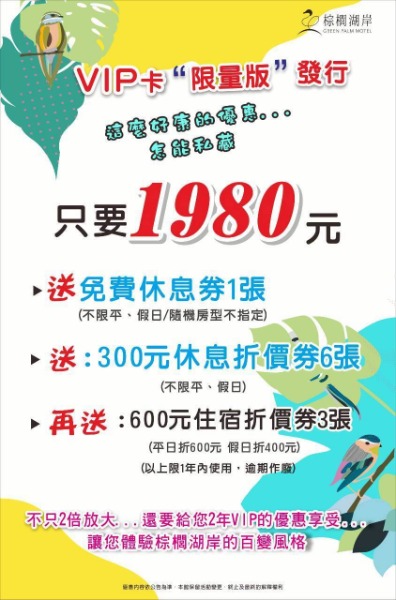 1.免費休息乙次 2.現金抵用劵 300元休息抵用劵*6張 600元平日住宿抵用劵*3張(假日住宿可抵用400元) 3.加碼"限量版VIP卡"無須申辦直接送